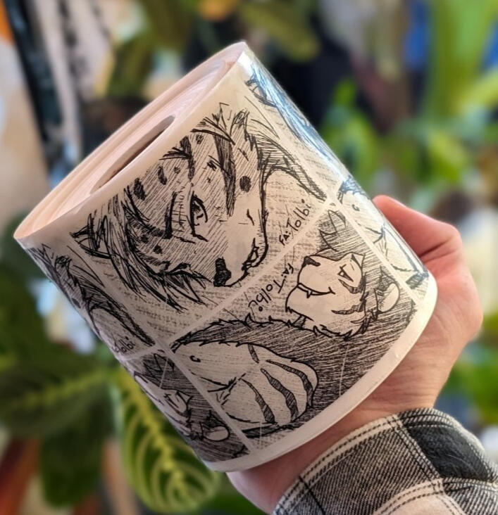 I'm ordering more blank stickers, and opening for limited commissions in this art style!Please note these are not your "normal" stickers, and are suited for permanent use.Please take caution with their use. These are outdoor-grade stickers, which are both waterproof and will not fade. They apply to most unprepared surfaces, are extremely difficult to remove. I take no responsibility for damage done with them.Each sheet contains two stickers and your contact information on the back. They are sized so that when you fold them in half, they are the size of a common trading card (and will fit in card sleeves).