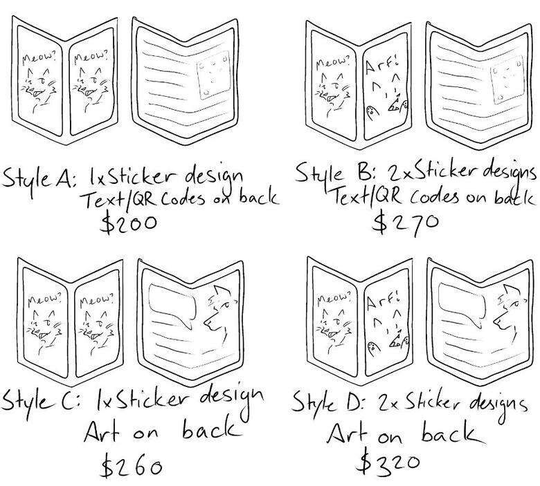 These are:・Option A (1x stickers, plain back): Two of the same sticker, your contact details on the back — 200USD・Option B: (2x stickers, plain back): Two different stickers per sheet, your contact details on the back — 270USD・Option C: (2x stickers, art on back): Two of the same sticker, with contact details and additional artwork on the back — 260USD・Option D: (2x stickers, plain back): You get two different stickers per sheet, with contact details and additional artwork on the back — 320USD